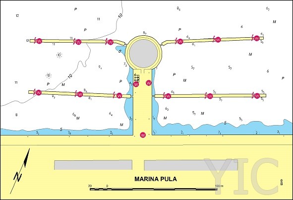 About us: VHF: 10 and 16 The biggest Istrian town, Pula, is a place filled with history. Its amphitheater, called by the locals the Arena, is one the best preserved structures from the Roman Empire period in the world. It is also a living testimony to the tumultuous thousand years of history of the area. The huge natural harbor has been used since ancient times: it has served as the main war port of the Austro-Hungarian Empire, of Byzantine properties in Italy and of Tito's Yugoslavia. In the very heart of this historic port, a few steps form the Arena, lies ACI marina Pula with 192 berths. It is equipped to receive 40 meter long mega-yachts. The international Pula airport is only 5 kilometers from